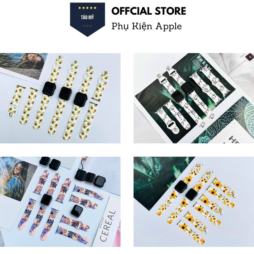 Giới thiệu Dây Apple Watch Cao Su Hoạ Tiết Trái Bơ, Trái Thơm , Gấu Mèo , Hoa Cúc Siêu Dễ Thương