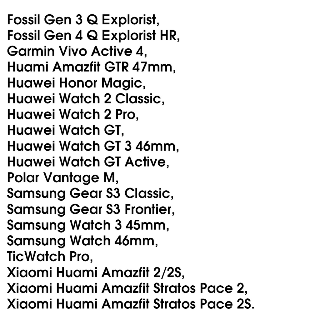 Fossil Gen 3 Q Explorist, Fossil Gen 4 Q Explorist HR, Garmin Vivo Active 4, Huami Amazfit GTR 47mm, Huawei Honor Magic, Huawei Watch 2 Classic, Huawei Watch 2 Pro, Huawei Watch GT, Huawei Watch GT 3 46mm, Huawei Watch GT Active, Polar Vantage M, Samsung Gear S3 Classic, Samsung Gear S3 Frontier, Samsung Watch 3 45mm, Samsung Watch 46mm, TicWatch Pro, Xiaomi Huami Amazfit 2/2S, Xiaomi Huami Amazfit Stratos Pace 2, Xiaomi Huami Amazfit Stratos Pace 2S