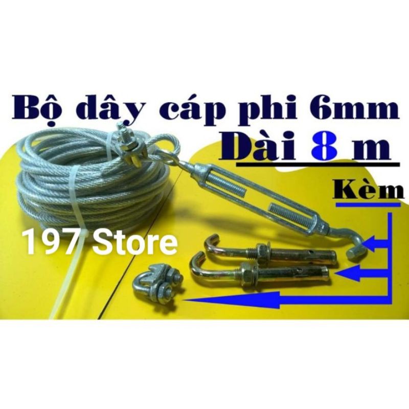 Combo đầy đủ phụ kiện với 8 mét dây cáp bọc nhựa 6 ly. 2 khóa cáp m8. 2 nở sắt có móc phi 10x10 và 1 chiếc tăng đơ giúp căng dâyGiá NAILONG