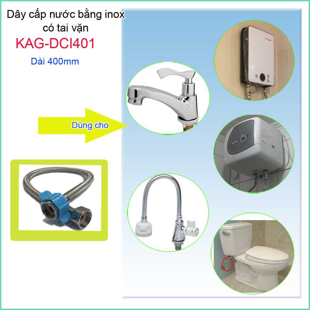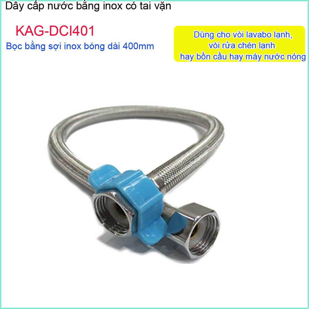 Dây cấp nước 4 tấc vòi nước, dây cấp nước inox có tai vặn KAG-DCI401 ( dài 40cm)Chất liệu: Dây cấp nước 4 tấc vòi nước, dây cấp nước inox có tai vặn KAG-DCI401 được bao bên ngoài lớp inox, dây cấp dùng kết nối dẫn nước giữa ống chờ trong hệ thống nước âm tường và thiết bị nước (như vòi lavabo, vòi chậu rửa chén bát, bàn cầu, máy nước nóng, bình nước nóng lạnh...)