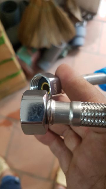 Dây cấp nước chỉ cần vặn ốc vào ren ngoài đảm bảo có roăng giữa dây cấp nước và ren ngoài.