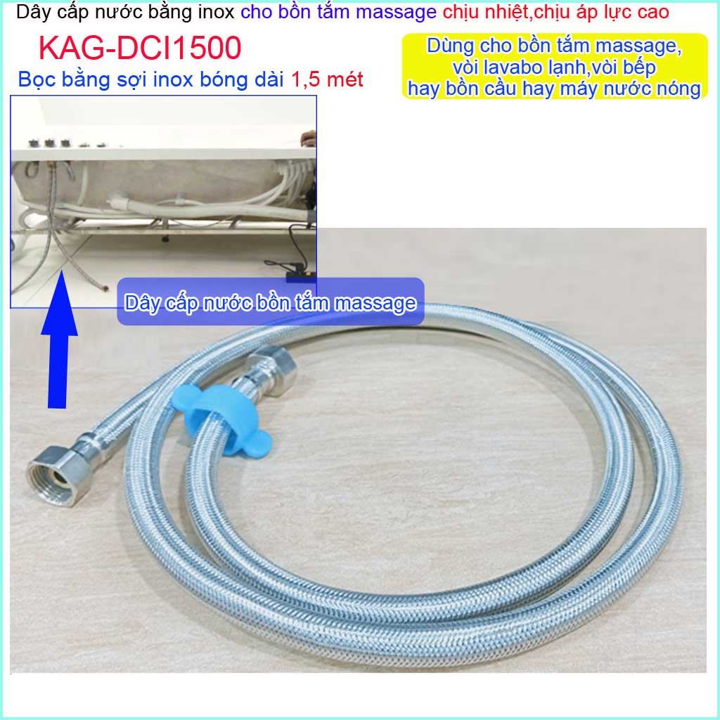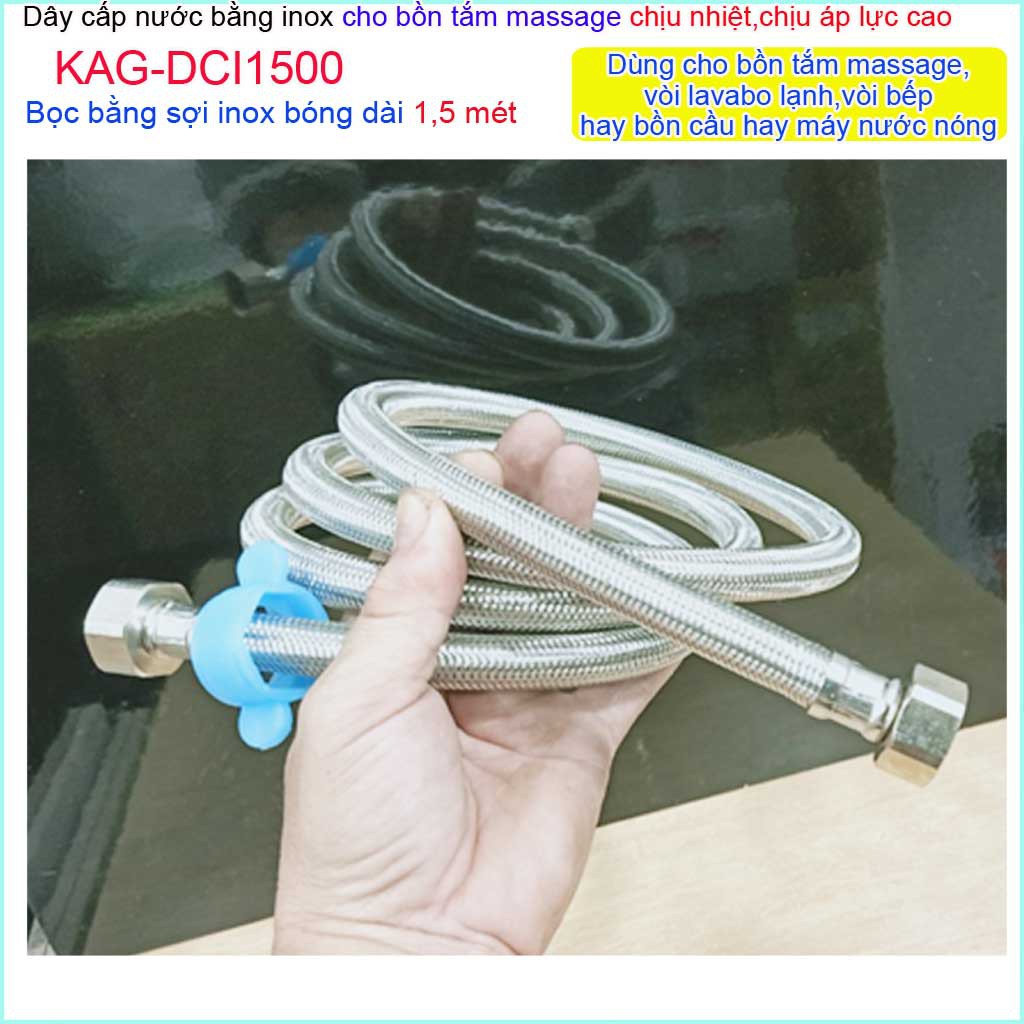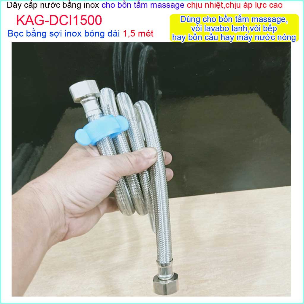 Dây cấp nước Inox chịu nhiệt KAG-DCI1500 (dài 150cm), dây cấp chịu áp 1.5m dây dẫn nước bình nước nóng lạnhChất liệu: Được bao bên ngoài lớp inox, dây cấp dùng kết nối dẫn nước giữa ống chờ trong hệ thống nước âm tường và thiết bị nước (như vòi lavabo, vòi chậu rửa chén bát, bàn cầu, máy nước nóng, bình nước nóng lạnh...)