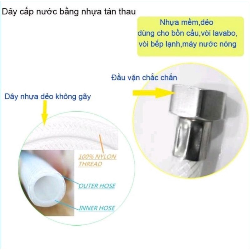 Dây cấp nước dùng cho bình nóng lạnh và vòi rửa được thiết kế chắc chắn giúp bạn dễ thay thế và sửa chữa, có thêm đầu tán nhựa để vạn bằng tay dễ dàng- Được làm từ nhựa cao cấp, chịu nhiệt, độ bền cao. Bên ngoài dây được bọc bởi sợi inox sáng đẹp.
