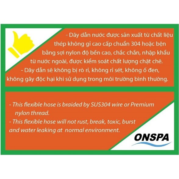 Hiện nay trên thị trường các loại dây cấp lavabo thường làm từ inox 201 có giá thành rẻ hơn 2 lần nhưng lại không bền, Đến với nhãn hiệu ONSPA bạn hãy yên tâm sử dụng. Sản phẩm vừa có mẫu mã đẹp, chất lượng tốt, giá lại phải chăng. Bạn sẽ cảm nhận được sự khác biệt với các sản phẩm khác cùng loại đang được bán trên thị trường.