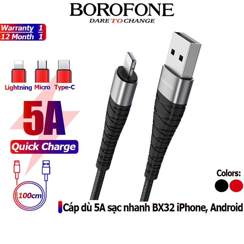 Dây cáp sạc nhanh BOROFONE BX32 bện dù dòng 5A chân Lightning, Micro, Type-C dây truyền tải dữ liệu dài 1m - Chính hãng