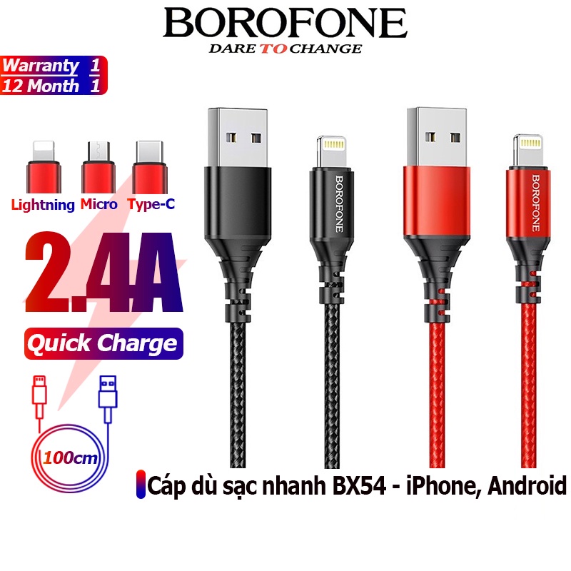 Dây cáp sạc nhanh BOROPHONE BX54 bện dù 2.4A đầu Lightning, Micro, Type-C dây truyền tải dữ liệu dài 1m - Chính hãng1.Giới Thiệu