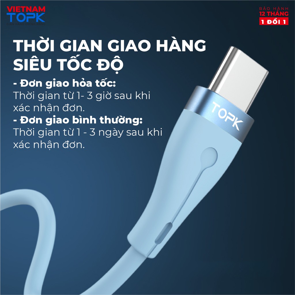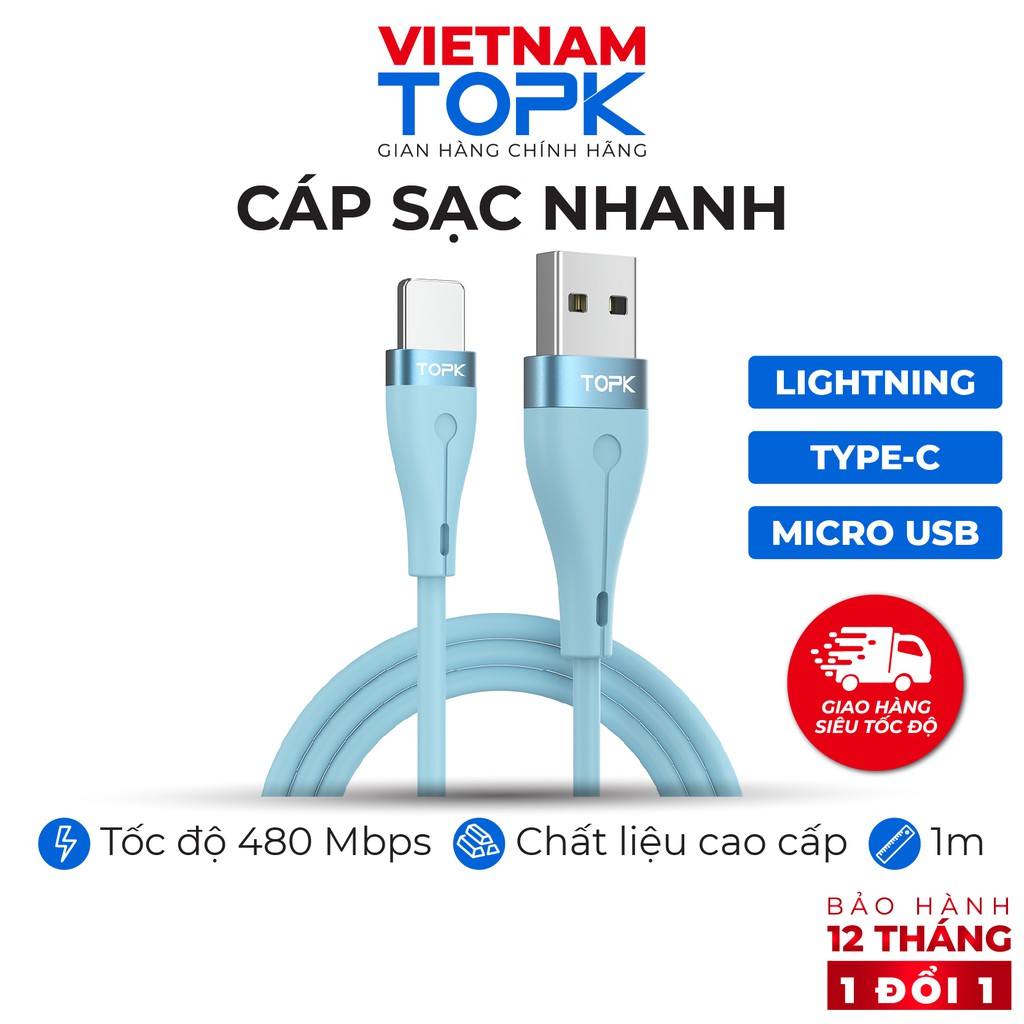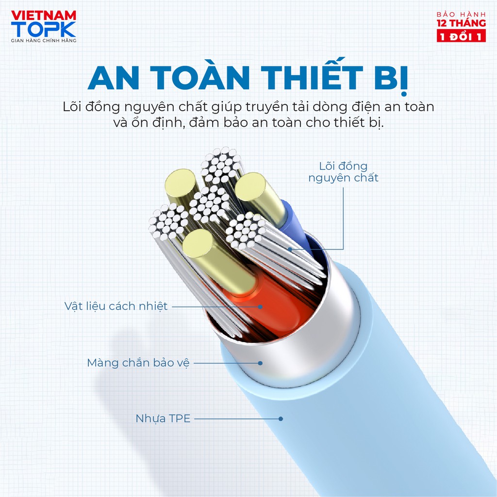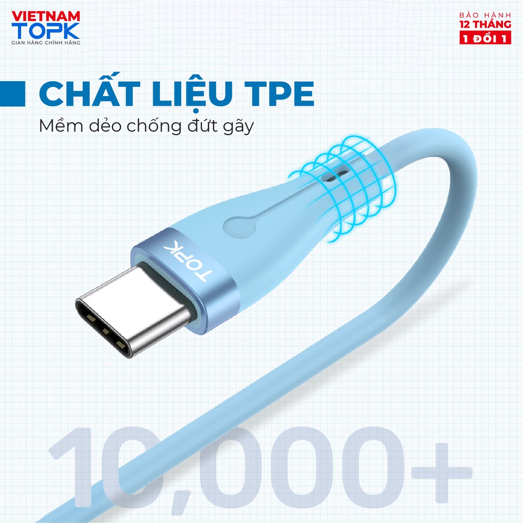 Dây cáp sạc TOPK AN46 dùng cho điện thoại Vỏ TPE silicon dẻo chống đứt gãy Hàng chính hãng Bảo hành 12 tháng 1 đổi 1