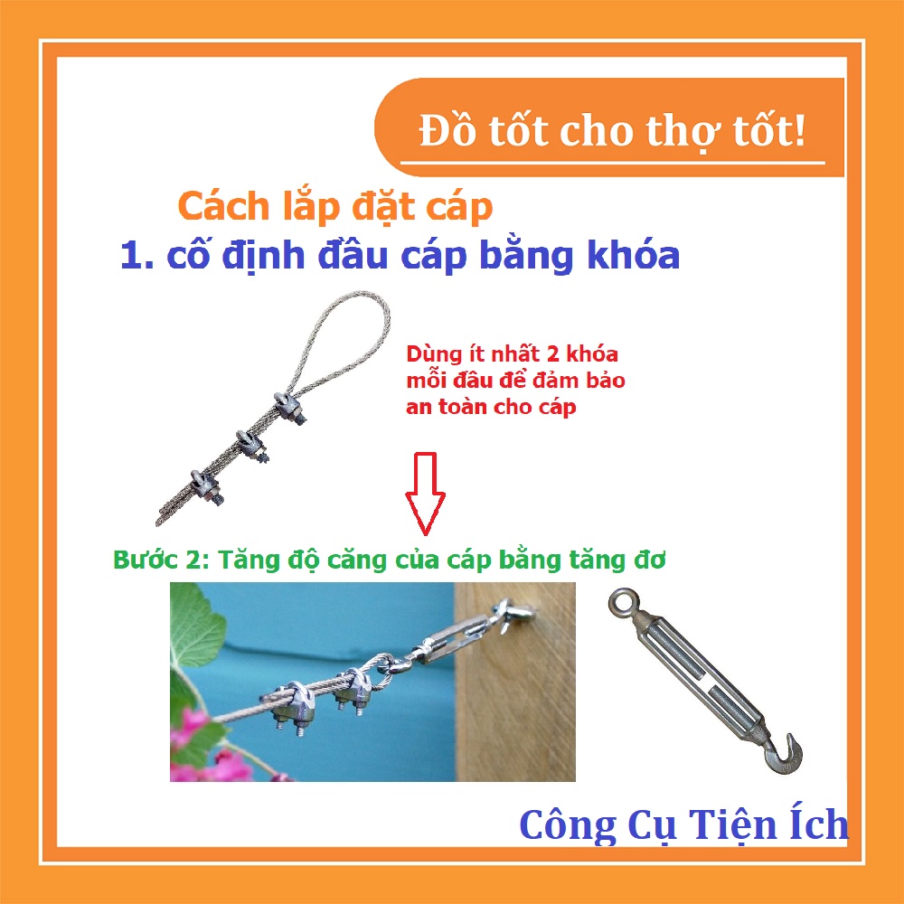 Cách lắp đặt: Dùng khóa cáp khóa đầu cáp, nên dùng mỗi đầu ít nhất 2 chiếc khóa, tiếp theo dùng tăng đơ để tăng độ căng của dây (khóa cáp và tăng đơ bán riêng ạ).