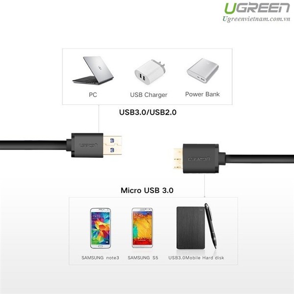 - Dây cáp USB 3.0 sang Micro B dài 1m chính hãng Ugreen 10841 cho phép bạn kết nối điện thoại di động, máy tính bảng, 3.0 Hub, HDD, đầu đọc thẻ... với máy tính, laptop của bạn với tốc độ truyền tải dữ liệu lên đến 5Gbps (Super Speed)