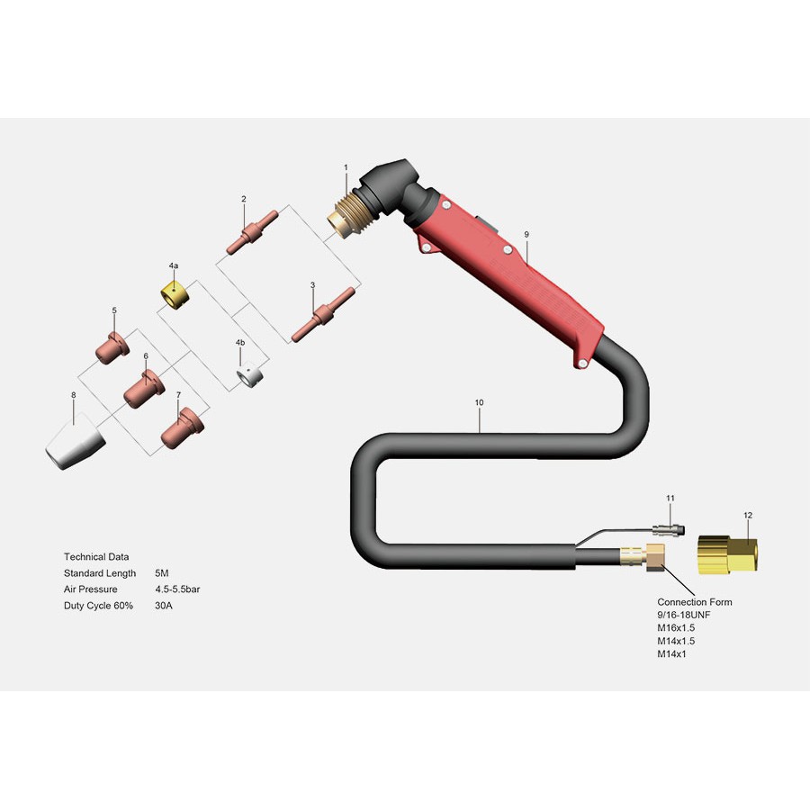 Dây Cắt Plasma 40A PT31 8m- Tay cầm đỏ công tắc bấm kiểu Panasonic mỏ cong