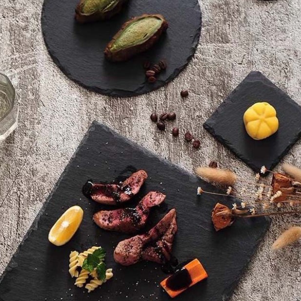 Nhà cửa & Đời sống > Bộ đồ bàn ăn > Khay, tấm lót bàn ăn || (DÀY-CHẤT LƯỢNG) ĐĨA ĐÁ ĐEN trang trí chụp ảnh food hình chữ nhật vuông. khay đá nướng decor trang trí bàn tiệc nhà hàngCòn hàng