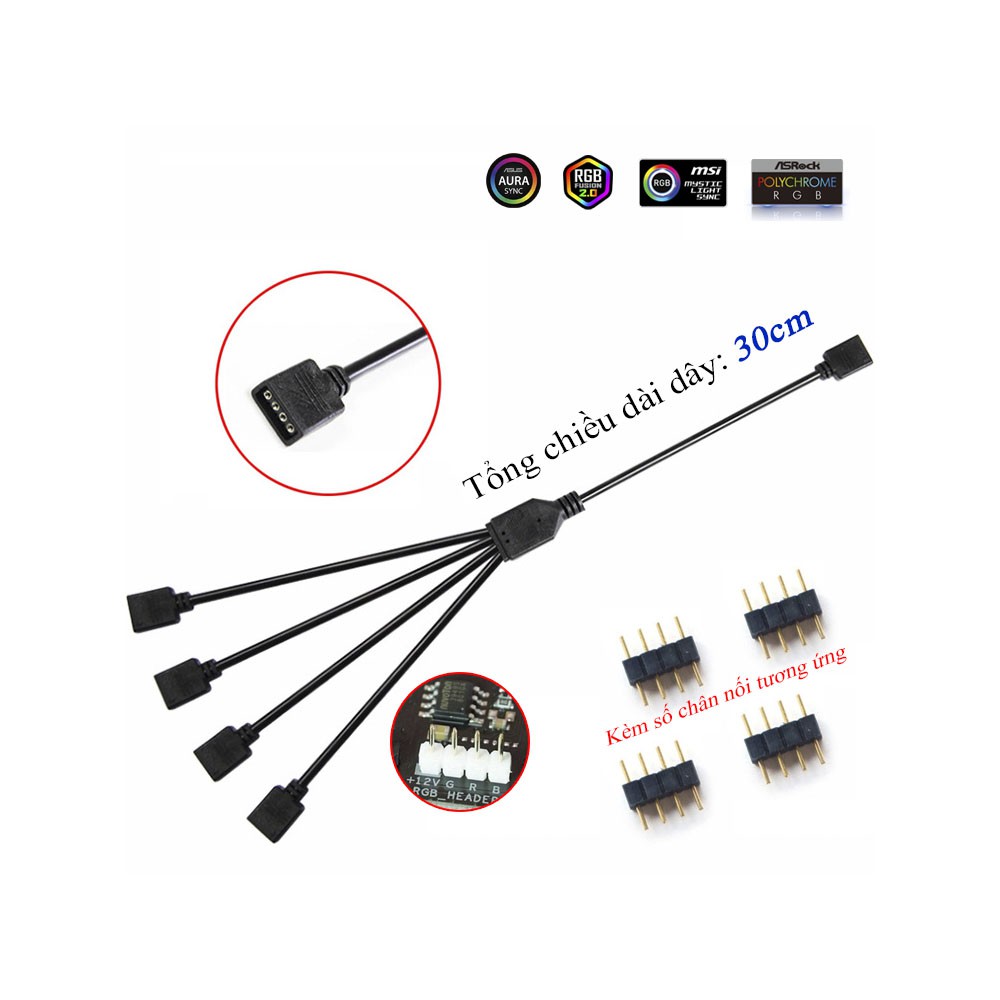 - Dây chia cổng RGB từ 1 ra nhiều cổng để tiện lợi hơn trong việc sử dụng nhiều thiết bị đồng bộ LED trên máy tính. Hỗ trợ công nghệ Asus Aura Sync, Gigabyte RGB Fusion, MSI Mystic Light- Dây có tổng độ dài 30cm