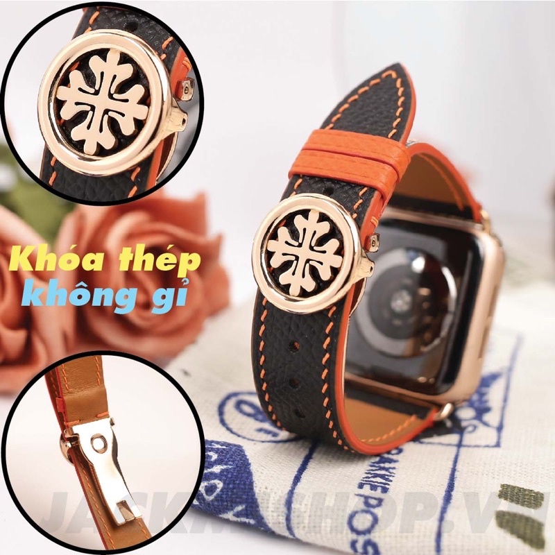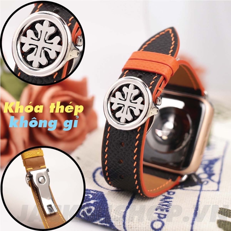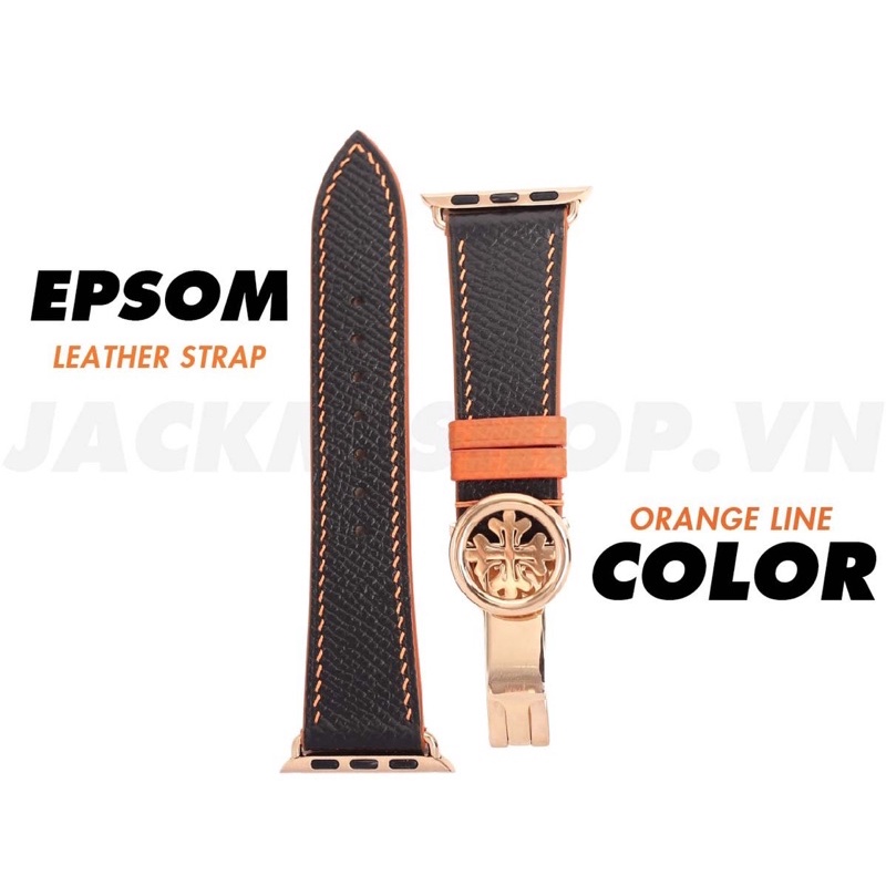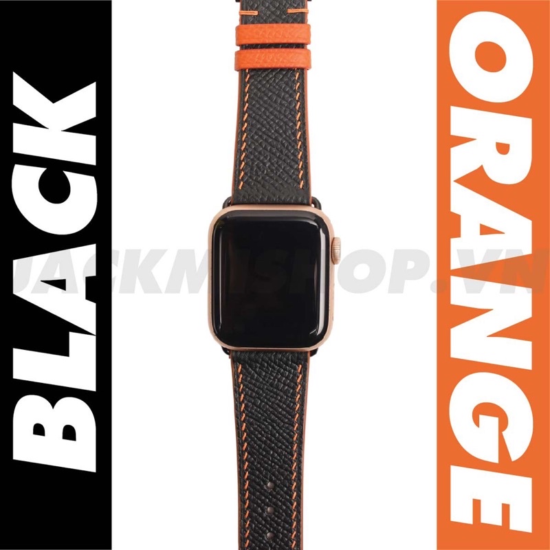 Giới thiệu [DÂY DA THẬT] DÂY DA BÊ EPSOM MAY TAY THỦ CÔNG MÀU ĐEN CHỈ CAM KHÓA PATEK CHO APPLE WATCH SERIES 1=>6 (BẢO HÀNH 1 NĂM)
