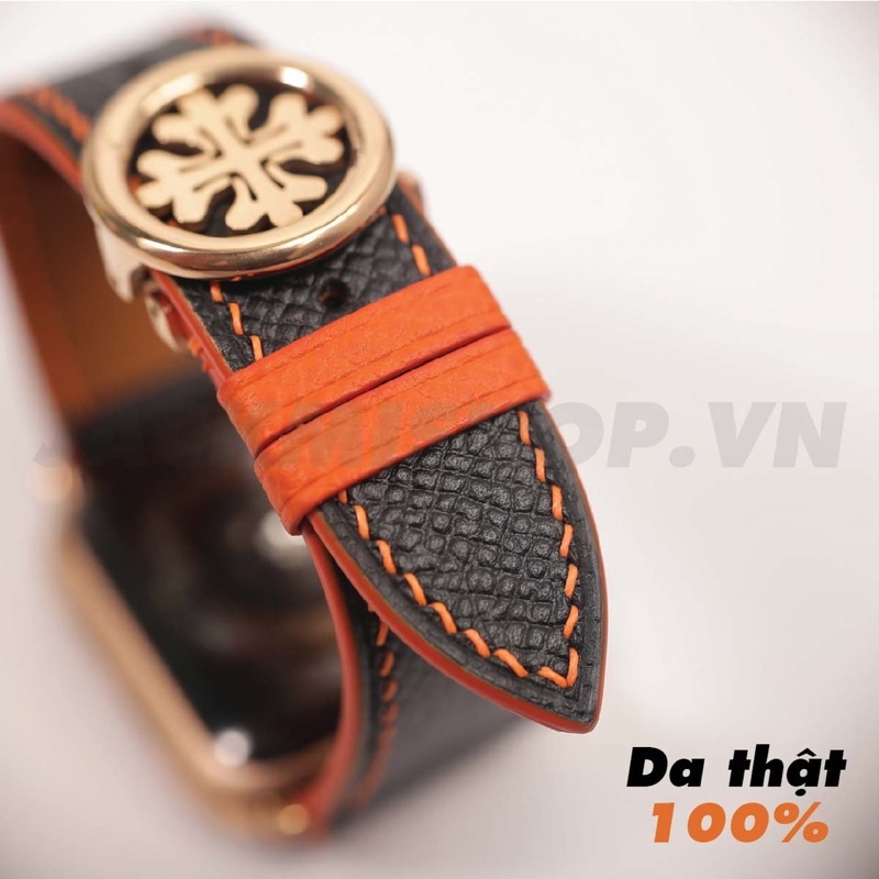 [DÂY DA THẬT] DÂY DA BÊ EPSOM MAY TAY THỦ CÔNG MÀU ĐEN CHỈ CAM KHÓA PATEK CHO APPLE WATCH SERIES 1=>6 (BẢO HÀNH 1 NĂM)