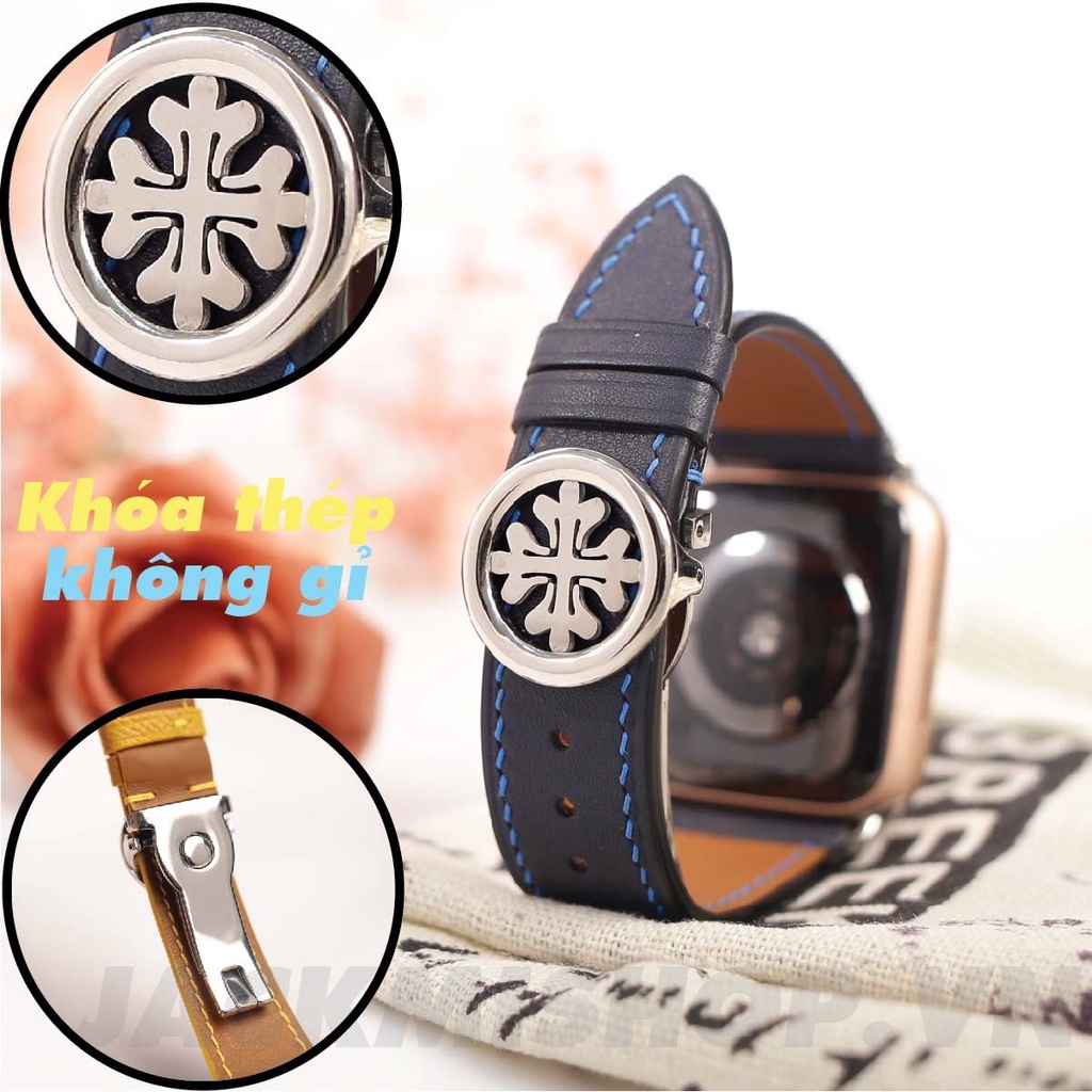 Giới thiệu [DÂY DA THẬT] DÂY DA BÊ SWIFT MAY TAY THỦ CÔNG MÀU NAVY CHỈ XANH KHÓA PATEK CHO APPLE WATCH SERIES 1=>6 (BẢO HÀNH 1 NĂM)