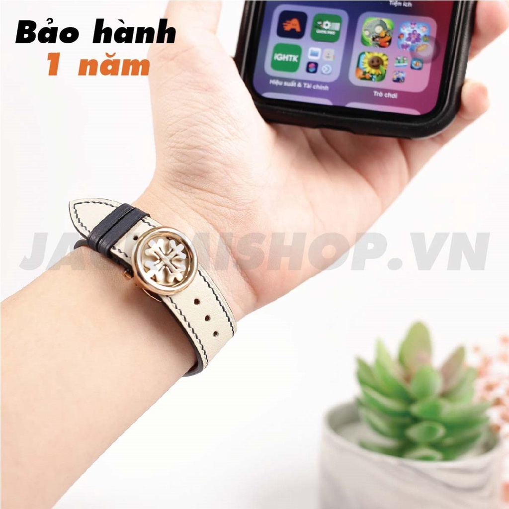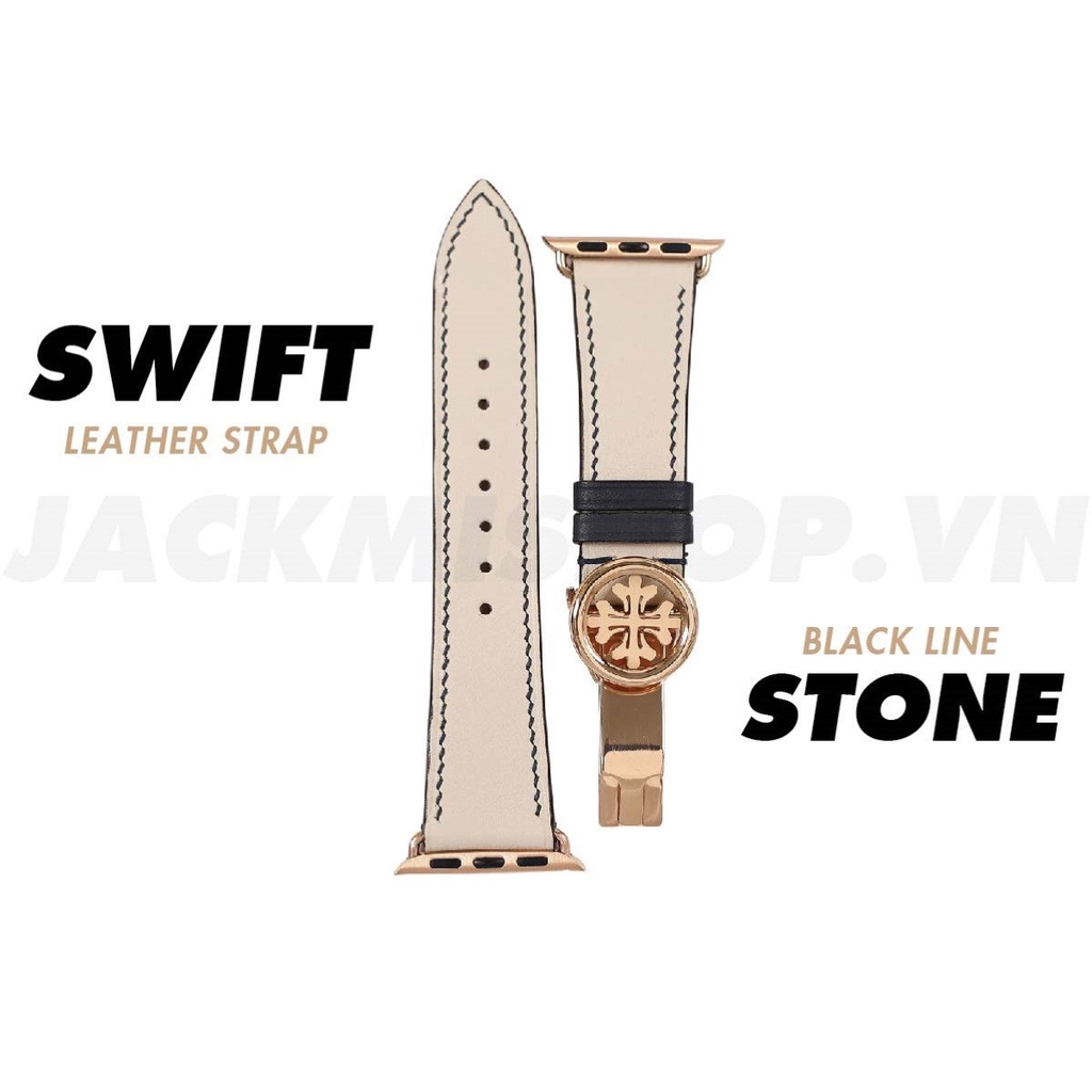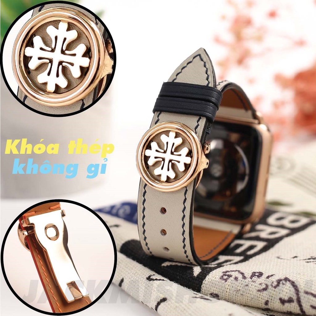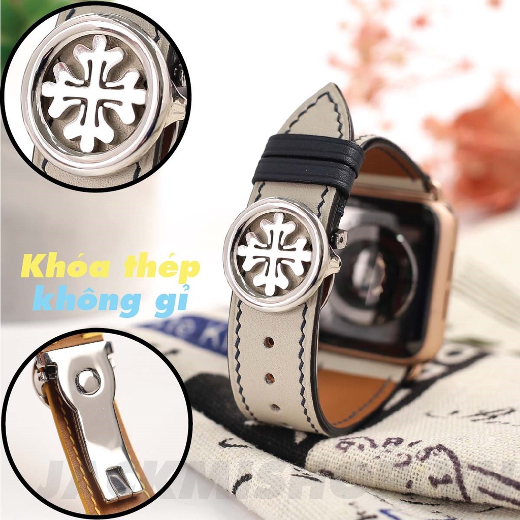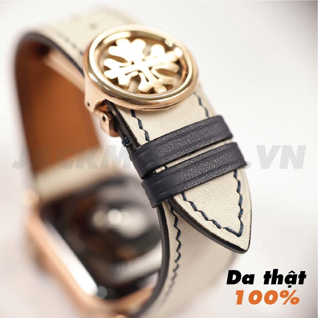 [DÂY DA THẬT] DÂY DA BÊ SWIFT MAY TAY THỦ CÔNG MÀU KEM CHỈ ĐEN KHÓA PATEK CHO APPLE WATCH SERIES 1=>6 (BẢO HÀNH 1 NĂM)
