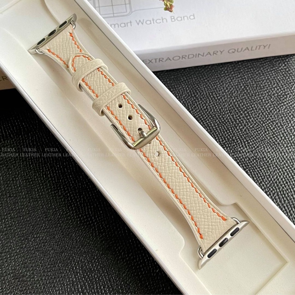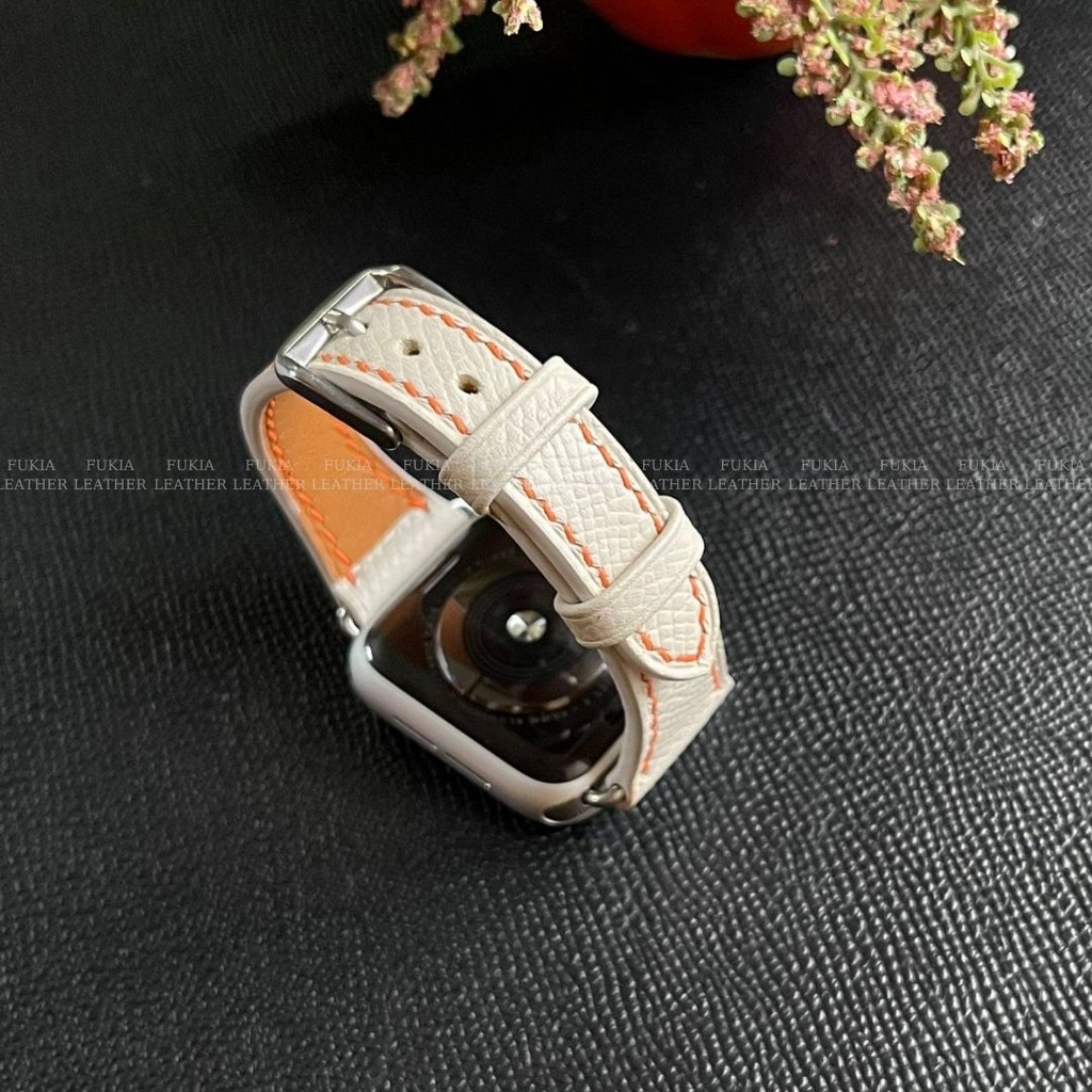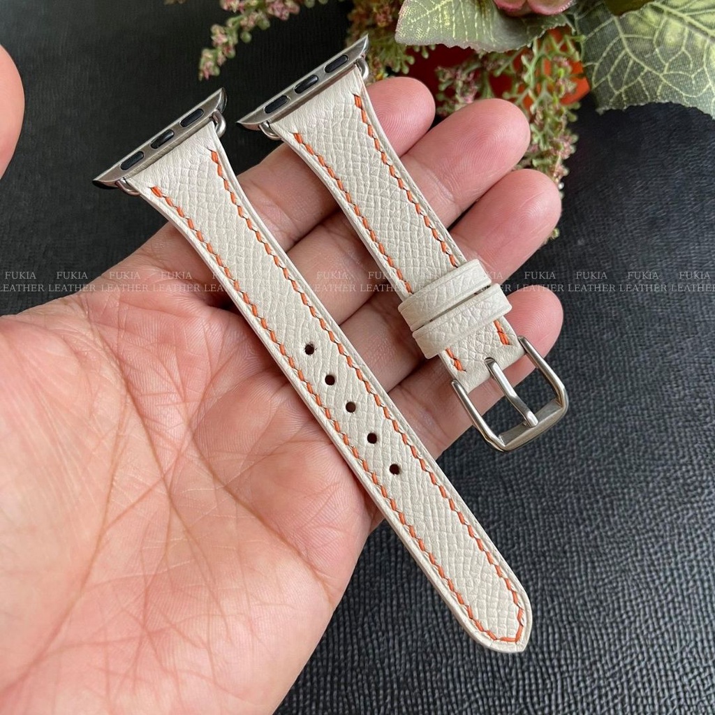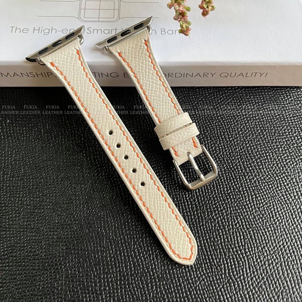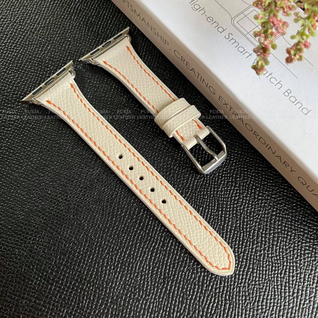 Dây da thủ công bản nhỏ Epsom Trắng Chỉ Cam dành cho Apple Watch, đồng hồ thông minh, đồng hồ cơ