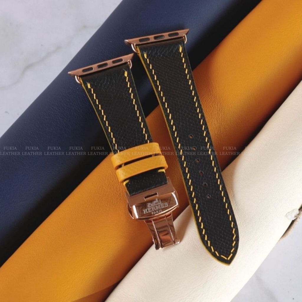 Dây da thủ công Epsom Đen Mix Vàng dành cho Apple Watch, đồng hồ thông minh, đồng hồ cơ