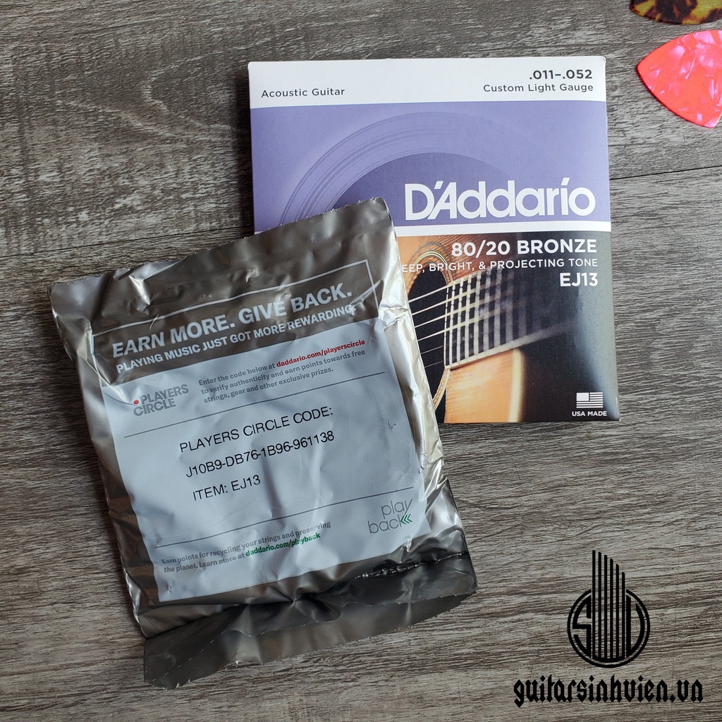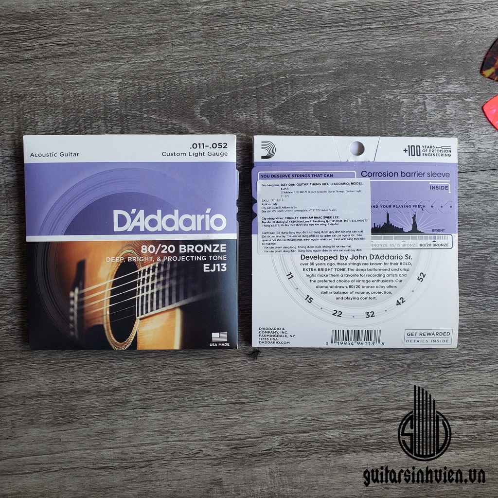 Daddario EJ13 80/20 Bronze Acoustic Guitar StringEJ13 mang lại sự dễ chịu cho người chơi, những người muốn âm thanh có chiều sâu và nổi bật. Độ căng dây nhẹ nhàng giúp bạn có thể sử dụng các kỹ thuật Bend ở những dây dưới tốt hơn.