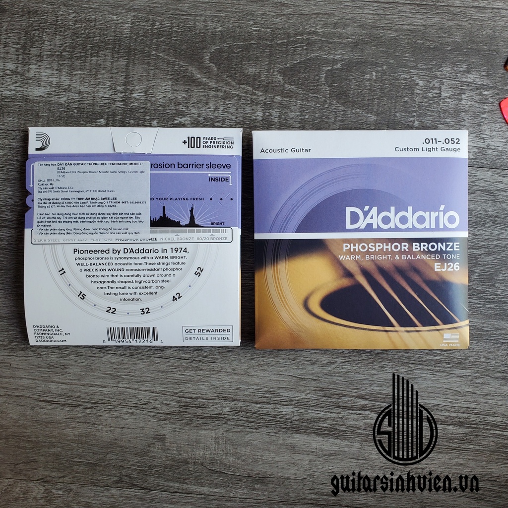 DÂY ĐÀN ADDARIO EJ26Dây đàn Guitar Acoustic D’ADDARIO EJ-26 (Custom Light Acoustic Guitar Strings) sử dụng hợp kim phosphor đồng để giữ được tính linh hoạt và màu sắc đẹp trong thời gian dài.