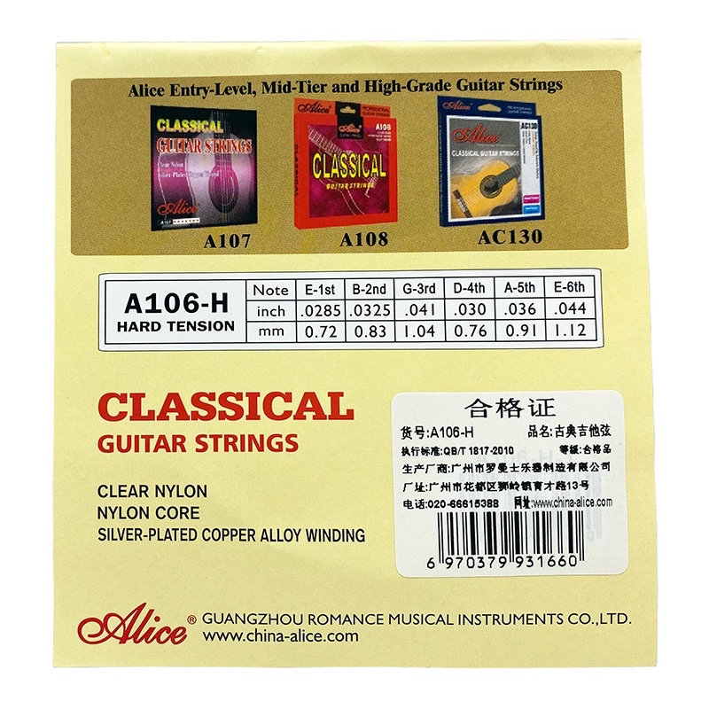 DÂY ĐÀN GUITAR CLASSIC ALICEDây đàn guitar classic Alice A106 thuộc loại trung bình, không quá mỏng cũng không quá dày, phù hợp với những bạn nào chơi đàn classic mà vẫn không quá nặng, không làm đau tay người dùng. Dây đàn guitar classic Alice A106 là dòng sản phẩm dây nylon của hãng Alice. Các dây đàn E-1, B-2, G-3 được làm từ nylon nhập khẩu, và D-4, A-5, E-6 được quấn tự động bằng đồng mạ bạc. Dây đàn Alice A106-H cung cấp cho cây đàn guitar của bạn giai điệu sáng và phong phú. Đây là loại dây phổ biến, được nhiều người yêu thích. Dây đàn Alice A106-H loại Hard Tension nhiều Treble, âm thanh nghe rõ ràng, sắc nét.