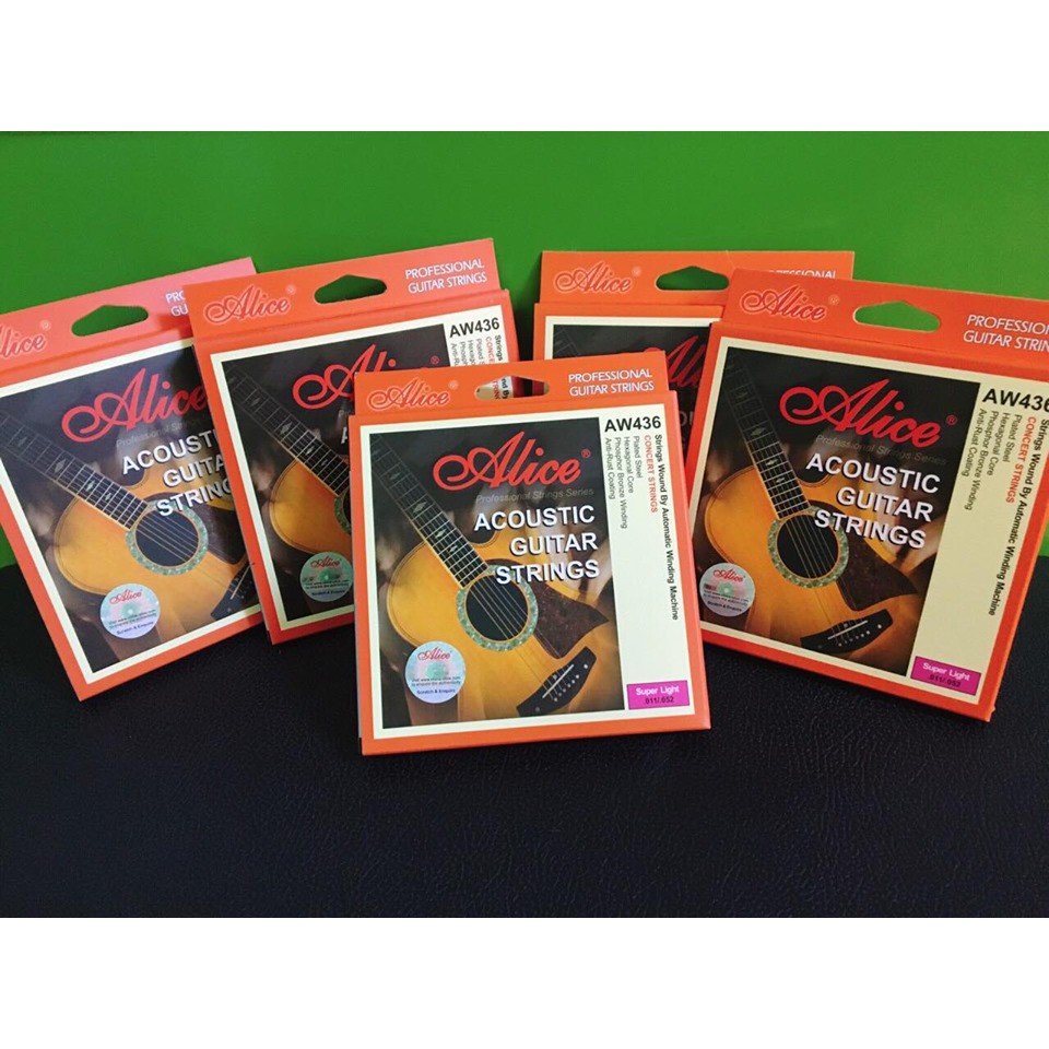 Dây đàn guitar acoustic Alice AW436 có kích cỡ 11-52, loại Super Light. Một bộ dây gồm 6 dây, dây 1 và 2 làm bằng thép chất lượng cao, các dây khác được phủ thêm hợp kim đồng kẽm.