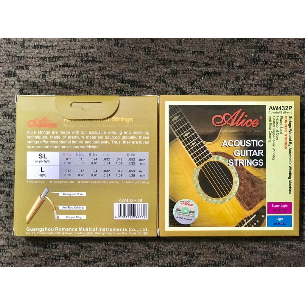 Thông tin sản phẩmDây Guitar Acoustic ALICE AW432 là dòng sản phẩm dây của hãng Alice kích cỡ 11-52, loại Super Light. Các dây Alice AW432 được bọc đồng Phốt-pho, cung cấp giai điệu sáng và phong phú. thích hợp với những người mới chơi guitar và những dòng đàn guitar tầm trung