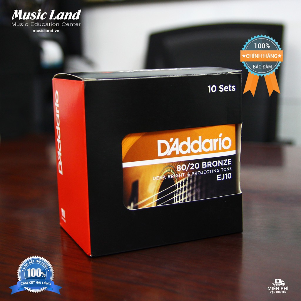 - Dây đàn Guitar Acoustic D'Addario EJ10 là dòng sản phẩm dây Bronze pha đồng (Bronze) của hãng D'Addario (Mỹ), kích cỡ 10-47, loại Extra Light (độ căng của các dây không giống nhau, hai dây cao - dây treble - có độ căng thấp hơn hai dây giữa với mục đích vừa tạo được chất âm sâu cho tiếng đàn vừa giúp người chơi dễ dàng bend nốt)