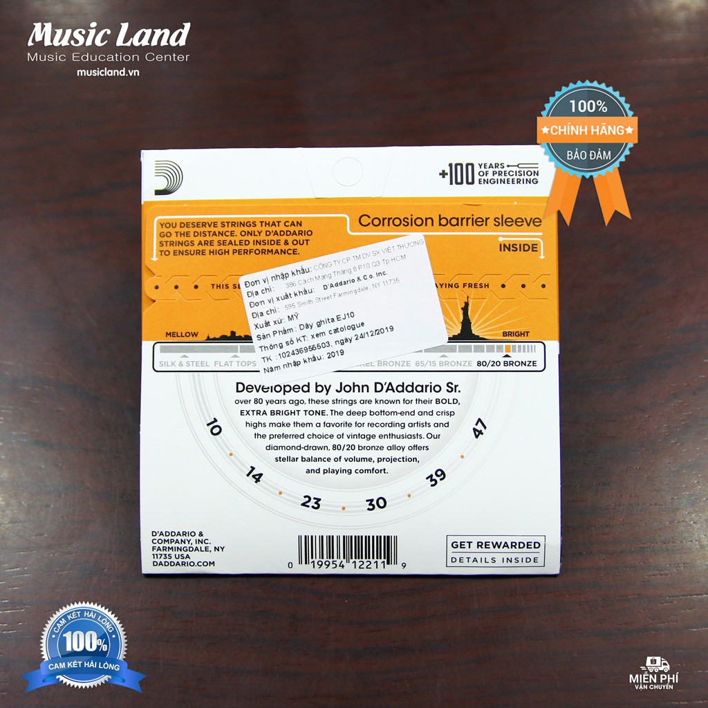 - Cam kết Dây đàn Guitar Acoustic D'Addario EJ10 chính hãng D'addario của Mỹ.