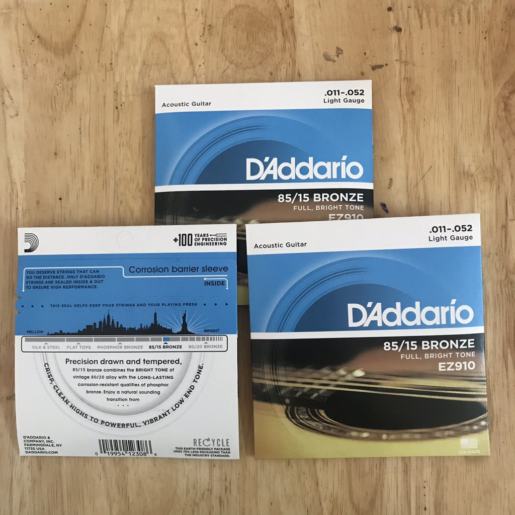 - Dây đàn Acoustic Guitar - D'Addario EZ910 là sản phẩm dây của hãng D'Addario, kích cỡ 11-52, loại Extra Light.- D'Addario EZ910 được cuốn đồng tỉ lệ 85/15 cung cấp cho cây đàn của bạn âm thanh tươi sáng. Dây đồng 85/15 kết hợp với độ sáng của dây hợp kim 80/20, cùng với độ bền tuyệt vời của các dây đồng phosphor
