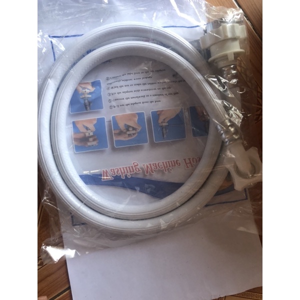 - Dây cấp có 2 đầu, 1 đầu gắn vào nguồn nước có khóa và khoăn vặn, 1 đầu gắn vào van cấp nước máy giặt có răng vặn