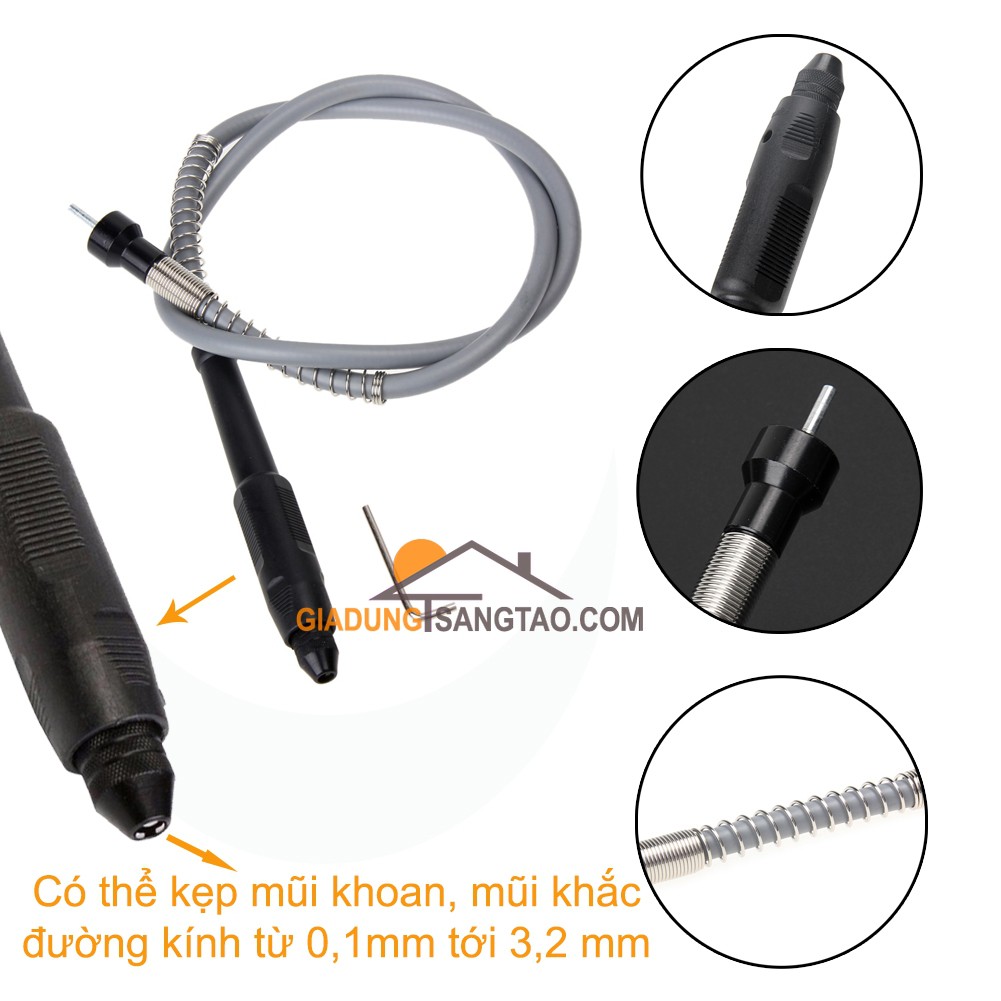 – Đầu lắp mũi khoan, mài, khắc có thể lắp vừa tất cả các mũi từ 0.1mm tới 3.2mm