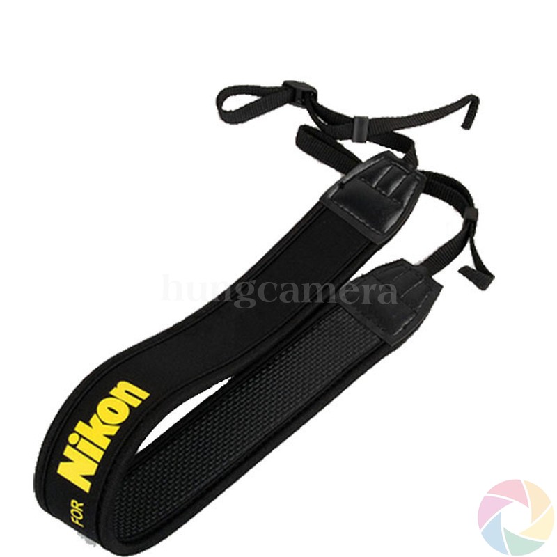 Dây đeo chống mỏi cho máy ảnh Nikon chữ Vàng, nền Đen