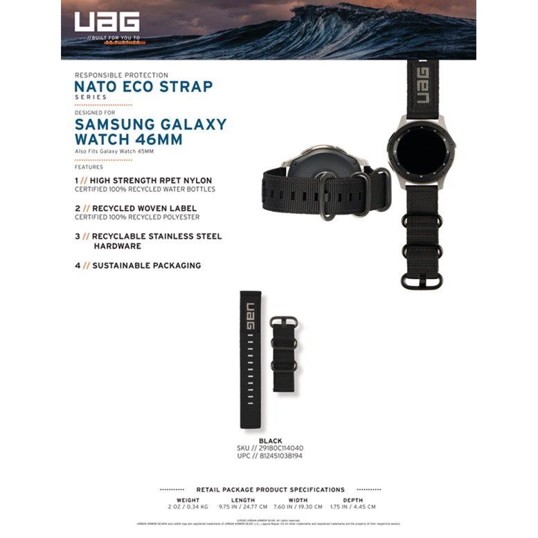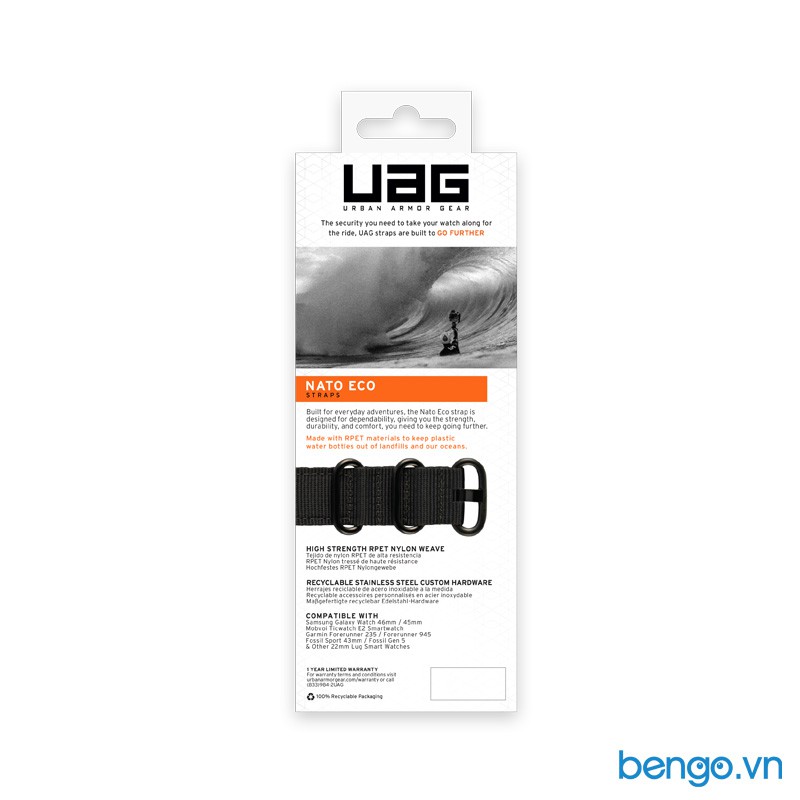 Dòng dây đeo UAG NATO Eco Series của UAG là dòng sản phẩm mới từ chất liệu Nylon RPET từ nhựa chai tái chế thân thiện với môi trường. Ngoài ra UAG Straps có 6 dòng khác: bằng da (Leather), dòng vải dù chuyên dụng (Active), UAG Nato (chất liệu nilon dệt), bằng Silicone gồm Civilian và Scout, dòng [U] DOT Silicone.