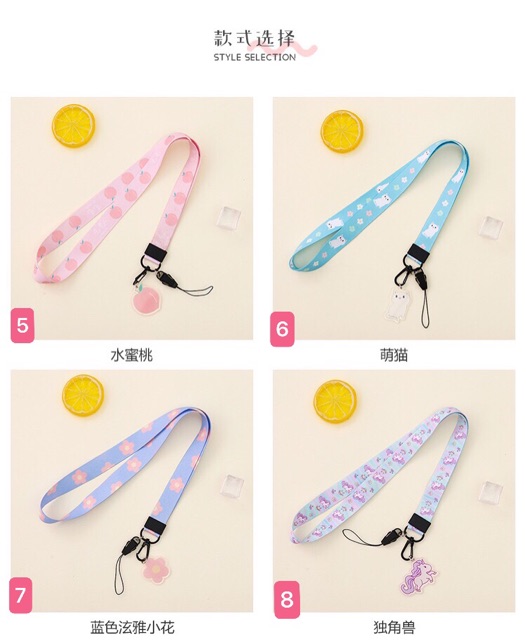 Zanmoo mô tả:- Dây đeo điện thoại cực xinh xắn, kèm móc treo hoa quả, ngựa Unicorn hot trend