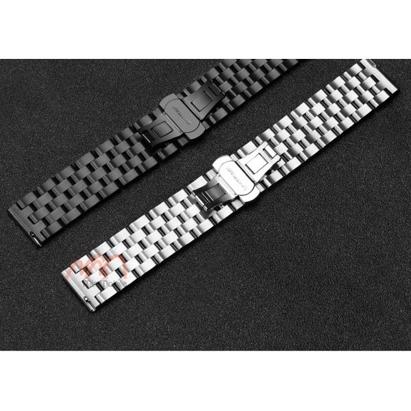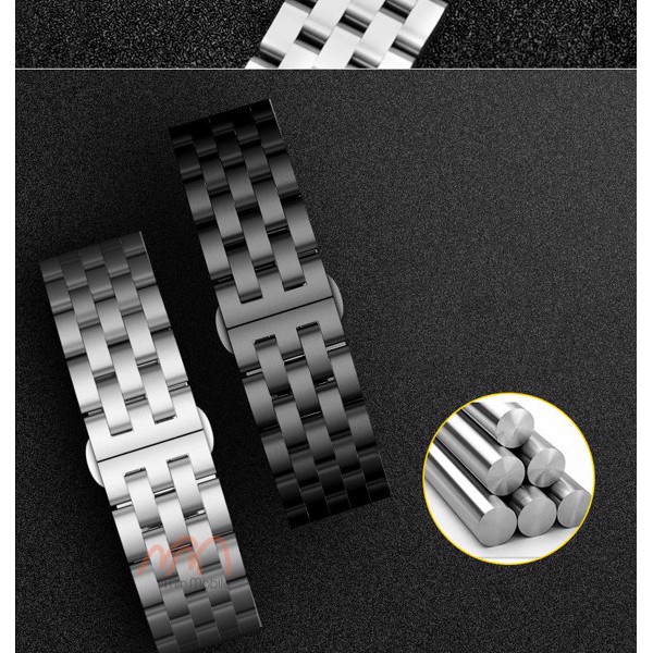 Dây đồng hồ Galaxy watch kim loại sử dụng chất liệu thép không gỉ, bền chắc chắn, những mắt xích được ghép nối bằng thép dầy và được sơn chống gỉ. Khóa gài được làm theo dạng mở cánh bướm, một chi tiết được đánh giá rất cao từ người dùng với thiết kế này tránh được việc đồng hồ bị rơi khỏi cổ tay khi bị xút chốt như loại dây khóa gài bình thường, khóa gài 2 nấc nên sẽ chắc chắn hơn, và sẽ cân bằng hơn khi người dùng cắt bớt mắt dây.