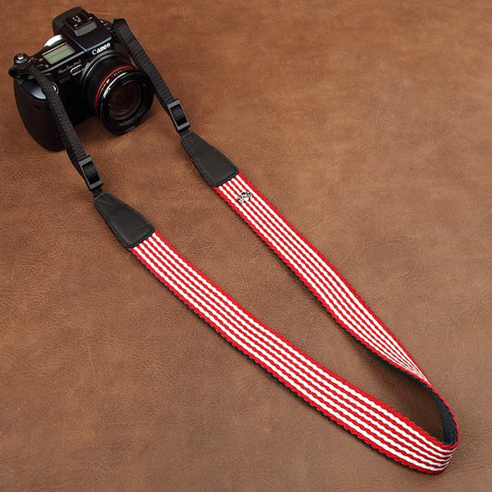 - Chất liệu: Da bò thật, vải dệt- Kẻ sọc đính huy hiệu máy ảnh độc đáo