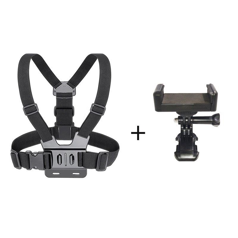 Khung gắn điện thoại tương thích với các máy có kích thước từ 3.5 đến 6,3 inch, trong bộ gồm có 1 dây đeo ngực, khung gắn điện thoại, adapter chuyển mount Gopro sang ren chuẩn của máy ảnh và các khung kẹp điện thoại.