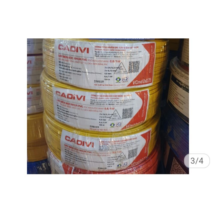 1. DÂY ĐIỆN ĐÔI 2 X 0.75 MM2 CADIVI có thiết diện 2X0.75 mm2, dây dài 100m/cuộn.