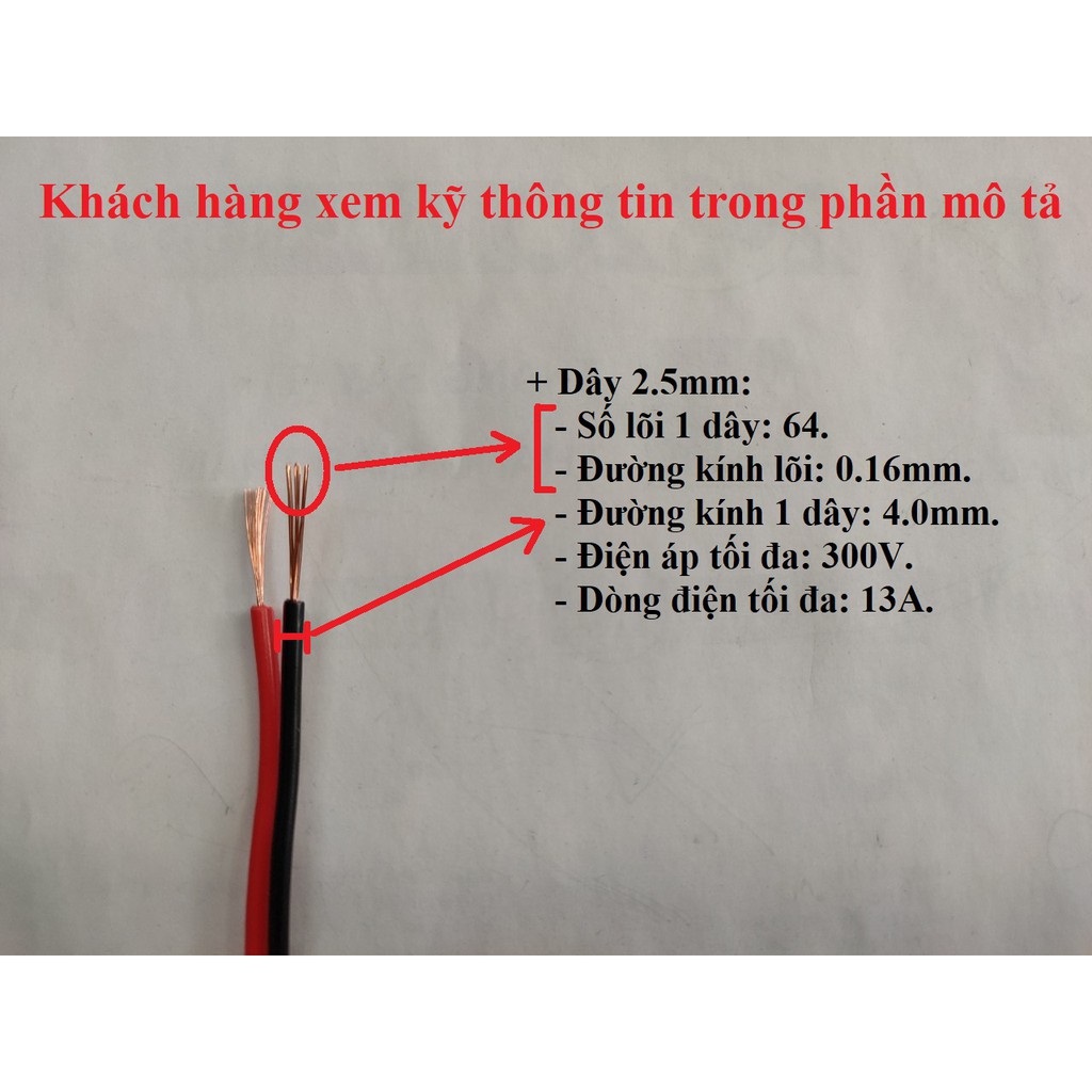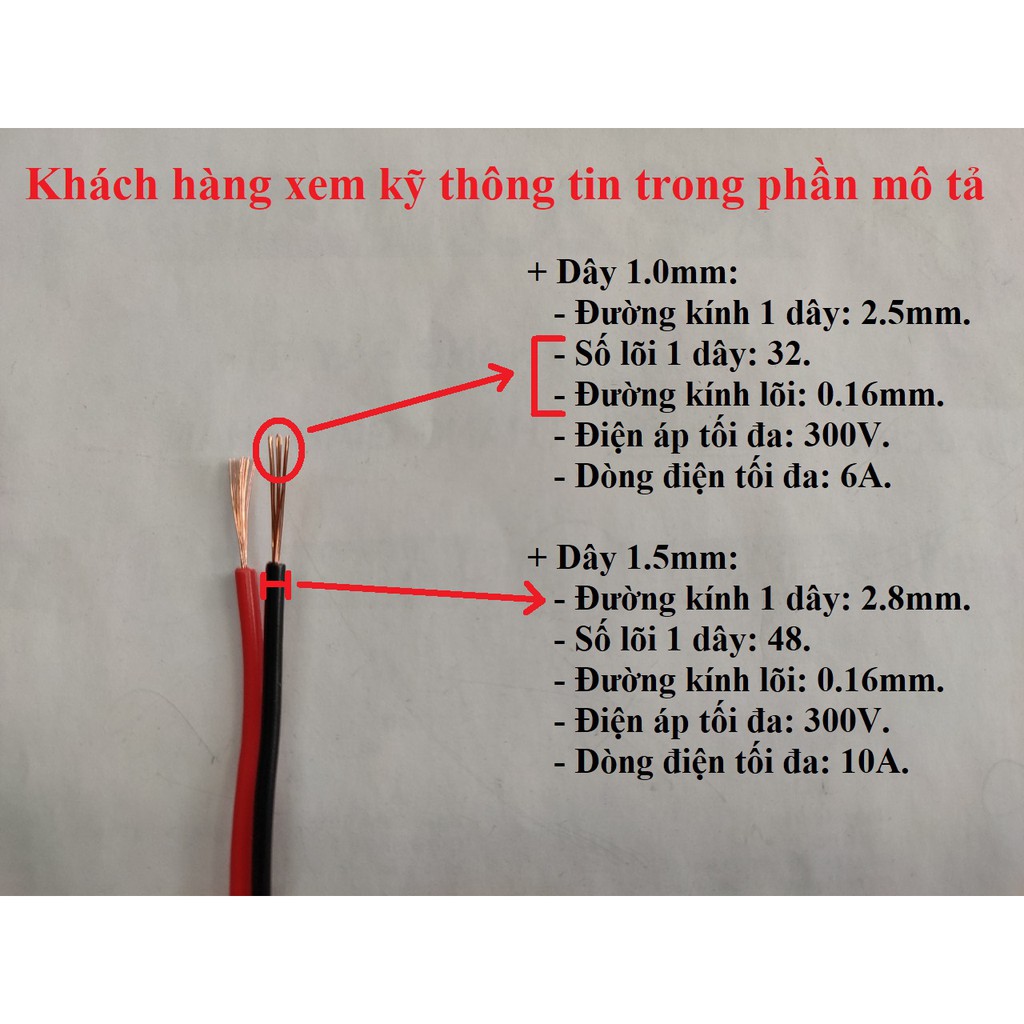 - Kích thước dây, sỗ lõi, dòng điện, điện áp, ... đã được chú thích đầy đủ, Khách hàng xem xét kỹ chọn loại phù hợp trước khi mua. Nếu cảm thấy dây mỏng- nhỏ không phù hợp với giá tiền hoặc giá bán quá cao, có thể tham khảo mua ở các Shop khác.