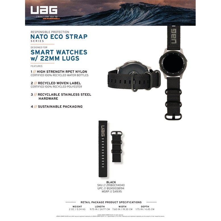 Dây đồng hồ vải dù UAG Nato Eco Universal Watch 22mm dùng được cho nhiều loại đồng hồ khác nhau, kể cả đồng hồ truyền thống với ngàm 22mm, là dòng sản phẩm mới từ chất liệu Nylon RPET từ nhựa chai tái chế thân thiện với môi trường. Ngoài ra UAG Straps có 6 dòng khác: bằng da (Leather), dòng vải dù chuyên dụng (Active), UAG Nato (chất liệu nilon dệt), bằng Silicone gồm Civilian và Scout.