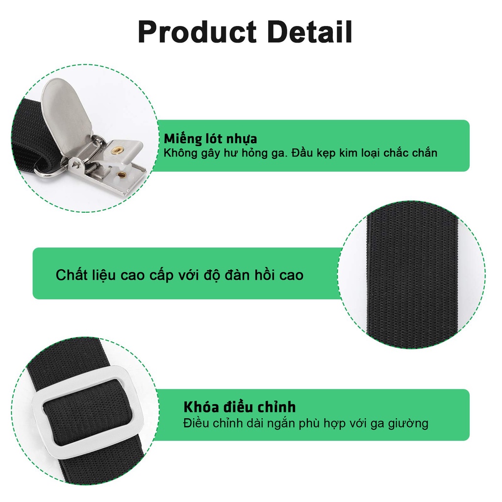 Chất liệu thun có độ co giãn tốt, đầu kẹp được làm bằng nhựa cứng hoặc sắt có lót nhựa, ko làm hư hỏng ga giường khi sử dụng