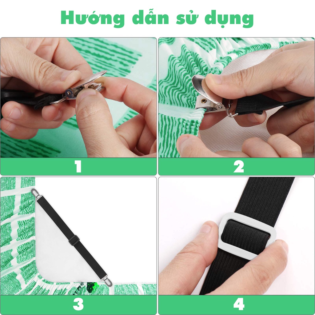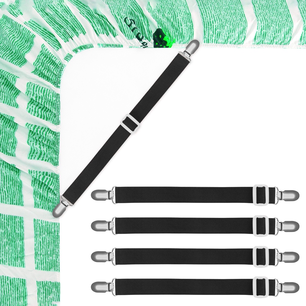 Bộ gồm 4 chiếc kẹp gắn ở 4 đầu drap nệm sẽ giúp giữ ga luôn ở vị trí cố định, không bị xê dịch, tạo không gian thoải mái, gọn gàng giúp bạn có cuộc sống vui tươi, an lành.