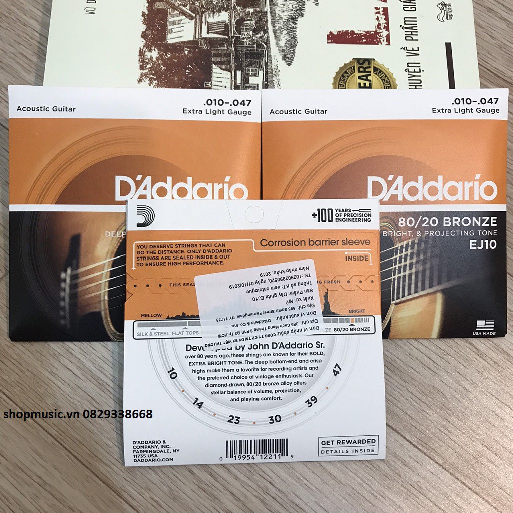 -Dây Guitar Acoustic - D'Addario EJ10 là dòng sản phẩm dây đồng (Bronze) của hãng D'Addario (Mỹ), kích cỡ 10-47, đây là mẫu dây đàn guitar acoustic có kích cỡ nhỏ nhất của hãng, loại Extra Light, thiết kế dành cho người chơi là những người mới tập (beginner) hoặc người chơi yêu thích dây có độ căng nhỏ, dễ bấm và dễ bend dây-Dây đồng (Bronze Acoustic Guitar Strings) còn được gọi là dây 80/20 với ý nghĩa tỷ lệ đồng chiếm 80% thành phần cấu tạo từng sợi dây (20% còn lại là kẽm hoặc thiếc), đây chính là mẫu dây kim loại đầu tiên thiết kế dành cho đàn guitar acoustic. Vào những năm 1930, John D'Addario Sr. và John D'Angelico lựa chọn dây đồng cho một kế hoạch phát triển thương hiệu D'Addario quy mô và bền vững, chúng ngay lập tức trở nên phổ biến, được ghi nhận là có chất âm sâu & rõ tiếng, ngoài ra chúng còn nhận được nhiều tình cảm từ những người chơi yêu thích các thiết kế truyền thống với bề dày lịch sử lâu dài.