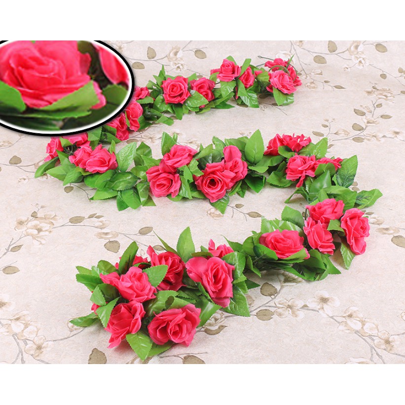 Kích thước: chiều dài dây tầm 2.4m, 1 dây gồm 9 đầu bông và lá như hình. 1 bông có đường kính tầm 8-9cm.Chất liệu: hoa lụa