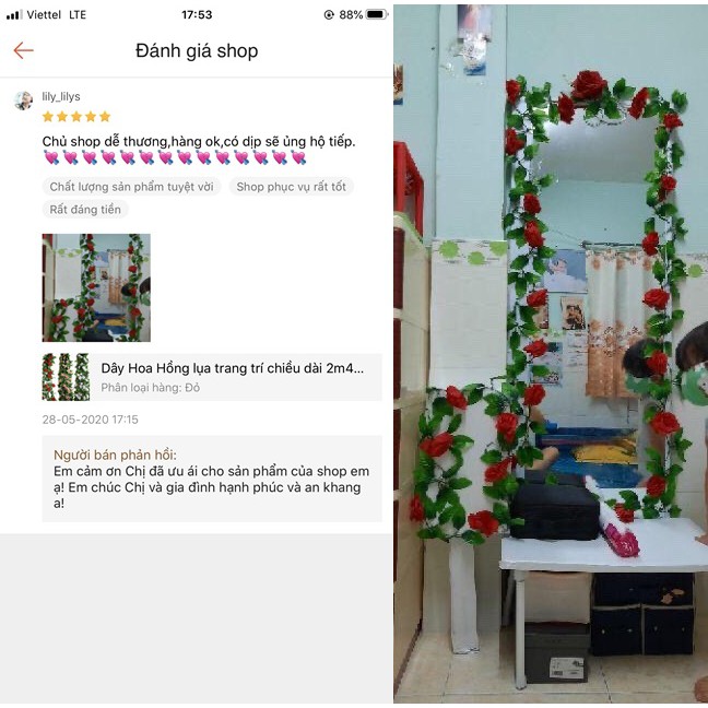 Nhà cửa & Đời sống > Trang trí nhà cửa > Hoa trang trí || Dây Hoa Hồng lụa chiều dài 2m4 gồm 9 bông hồng giống thật 99% - Hoa giả trang tríCòn hàng