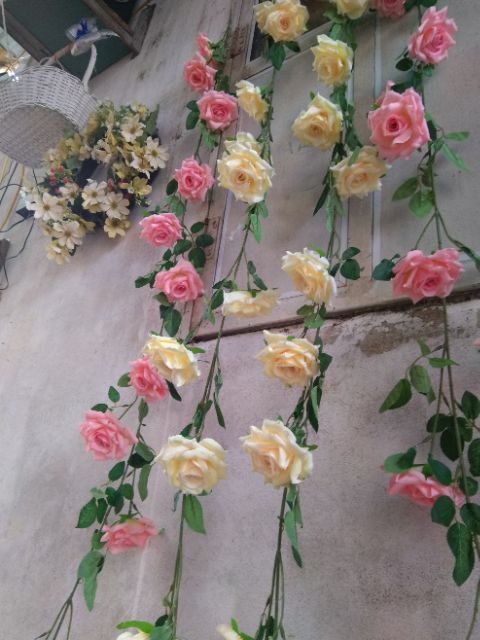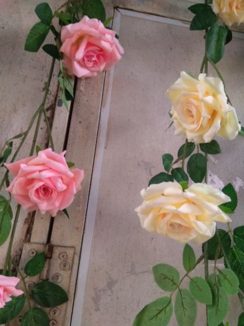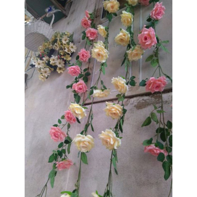 Dây hồng leo trang trí nhà cửa, sự kiện cưới hỏi, studio, spaDây dài 2met có lõi thép để uốn, bông hồng vải lụa mềm màu sắc tự nhiên