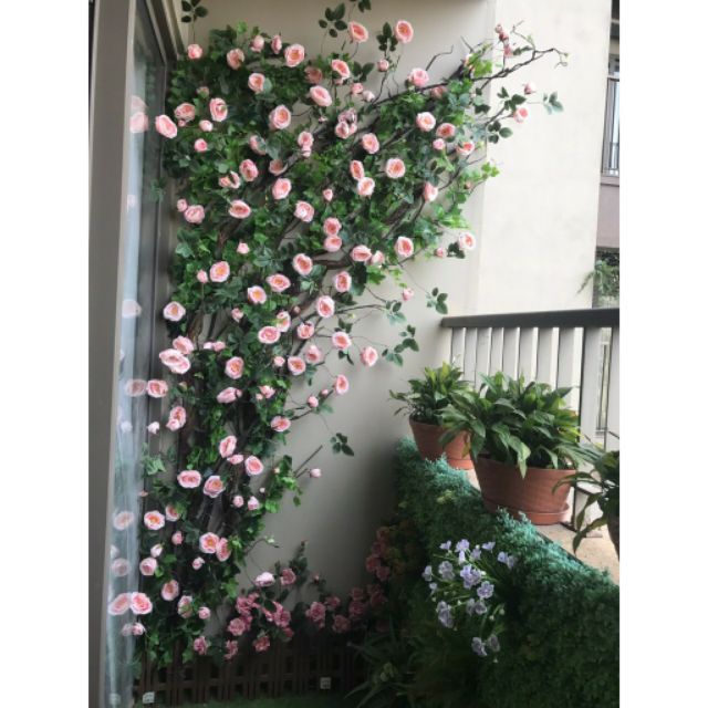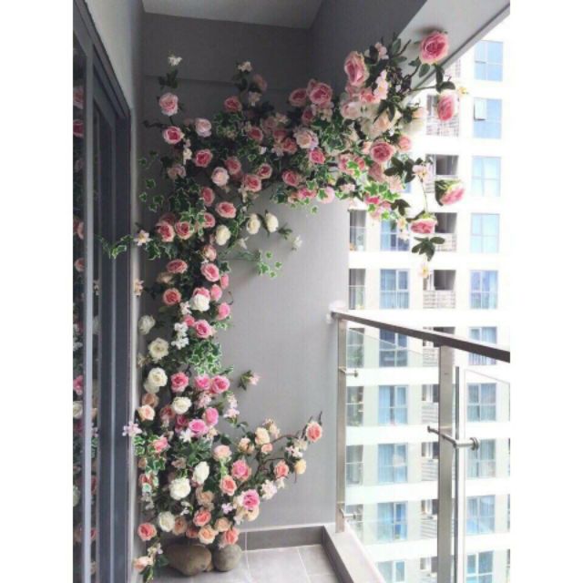 - Với không gian tường bên ngoài nên chọn những mẫu hoa dây leo để trồng, vừa có tạo sức sống tốt lại mang thiên nhiên gần tới ngôi nhà bạn. Những loại hoa tươi, cây hoa sẽ có thể phát triển theo thời gian và gia chủ có thể thư giãn bằng cách chăm sóc và ngắm chúng mỗi khi rảnh rỗi. Hoa hồng lụa cũng sẽ giúp bạn được điều đó, đây là loại trang trí ban công và logia chung cư khá được ưa chuộng hiện nay trên thị trường.