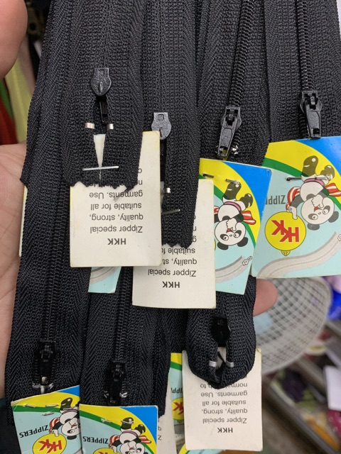 Dây kéo thương hiệu HKK đuôi đóng, có 2 màu đen và trắng. Dùng may bao áo gối,...Size 30cm : 35k/lốc (12sợi cùng màu)