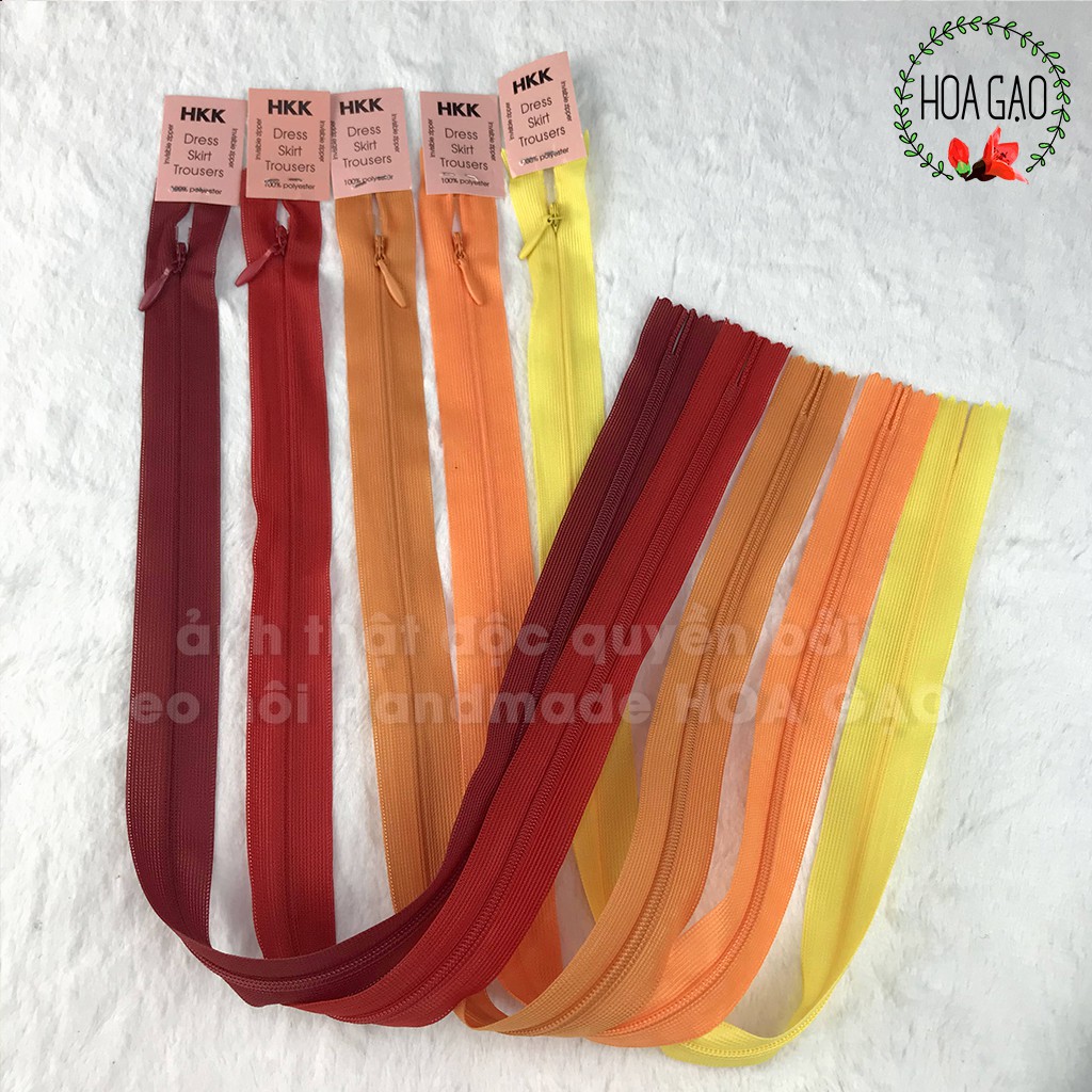 Dây kéo khoá hiệu HKK chất liệu tốt nhất dây mềm mại và không bị giãn dây khi tra vào váy, giảm thiểu độ gợn sóng dây kéo khi may thành phẩm. Nhiều màu dễ dàng lựa chọn dây khoá kéo.